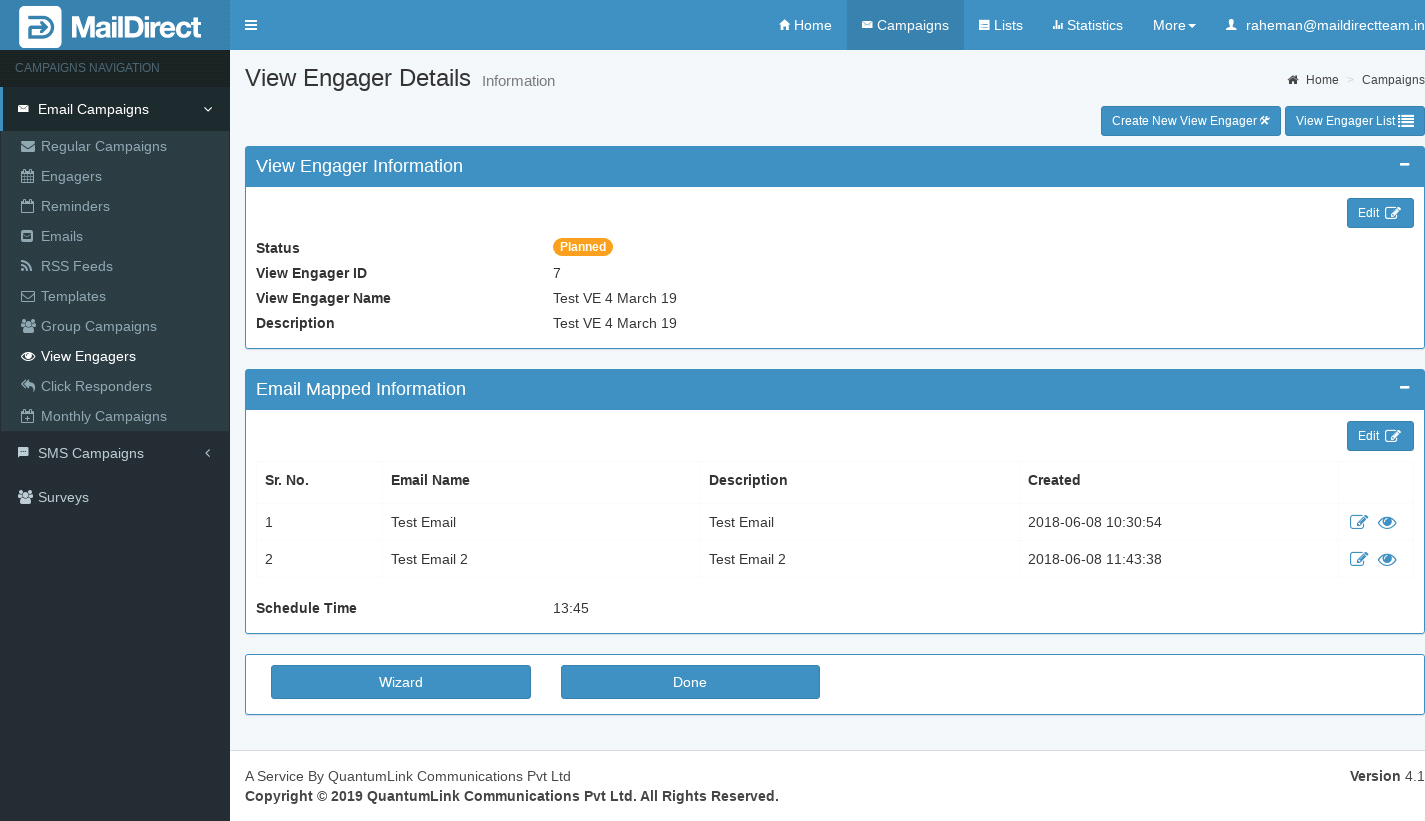This section displays list of Email Mapped to View Engager. This displays email details like Email Name, Description and Created Date with Edit link and Preview Button and Schedule Time.