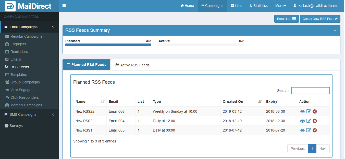 The list of Planned and Active RSS Feed are provided in Tabs, with individual row which displays RSS Feed Name, Name of the Email Mapped, Count of the List Mapped, RSS Feed Type, Created On Date, Expiry Date and Action. The Actions include