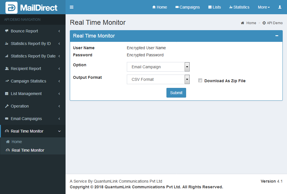 - The API Retrieves the list of Real Time Monitor details based on campaign type – Email Campaign, SMS Campaign and Survey.