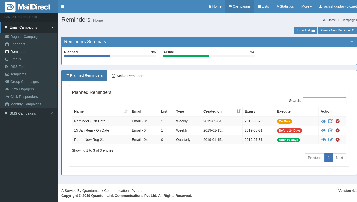 The list of Planned and Active Reminder are provided in Tabs, with individual row which displays, Reminder Name, Name of the Email Mapped, Count of the List Mapped, Reminder Type, Created On Date, Expiry Date, Execute and Action. The Execute Section displays the day of Execution i.e. On Date, Before Days or After Days. The Actions include