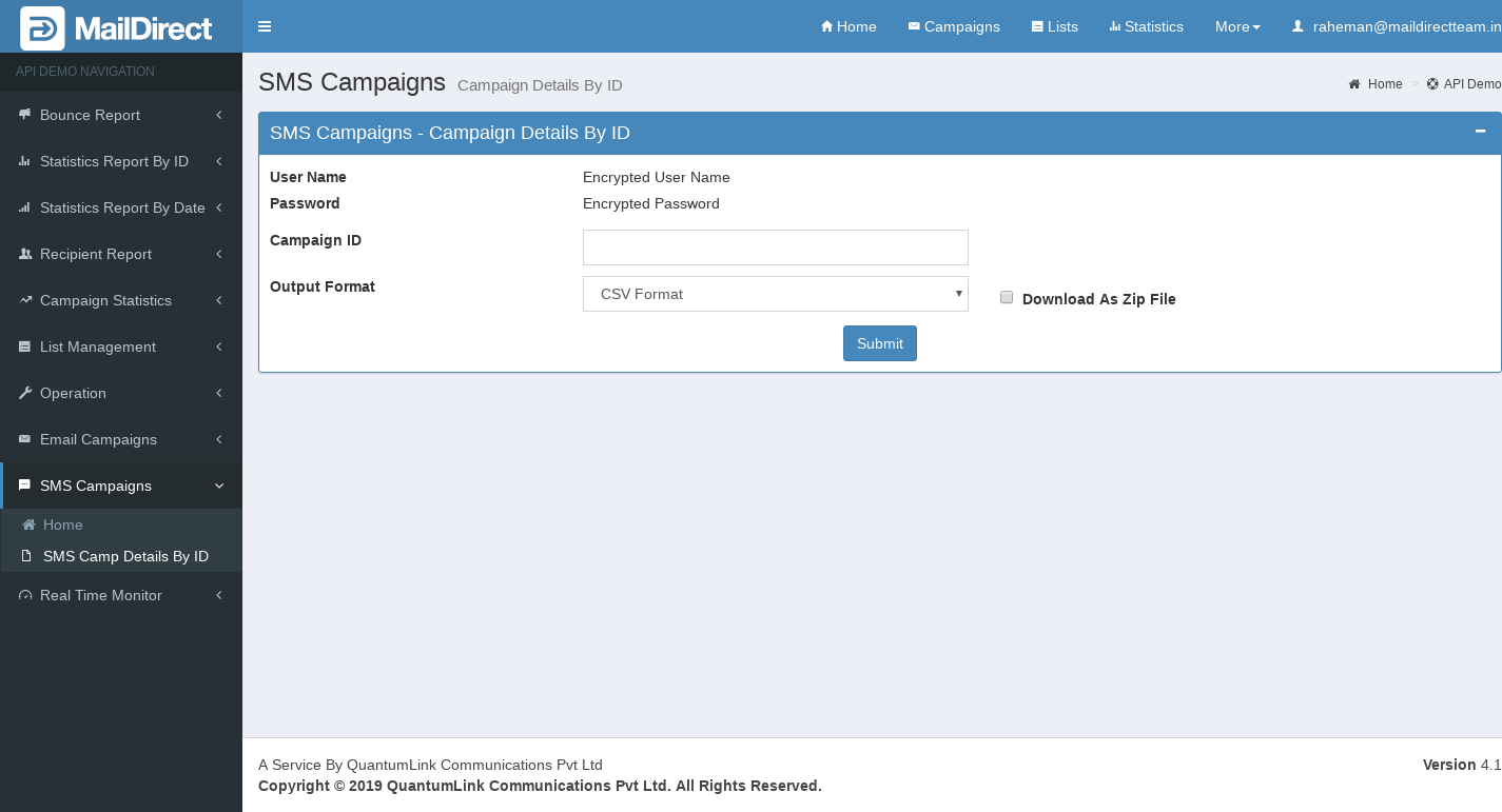 - The Details includes The parameters are ID, Campaign Name, Campaign Description, From Label, Message, Msg Size, List Count, List Ids, List Names, List Recipient Counts, Total Recipients, Result Based Email Campaign ID, Result Based Email Campaign Name, Result Based Type, Sms Template ID, Sms Template Name, Created Date Time, Send Date Time, Over Date Time, Schedule Date Time and Status.
