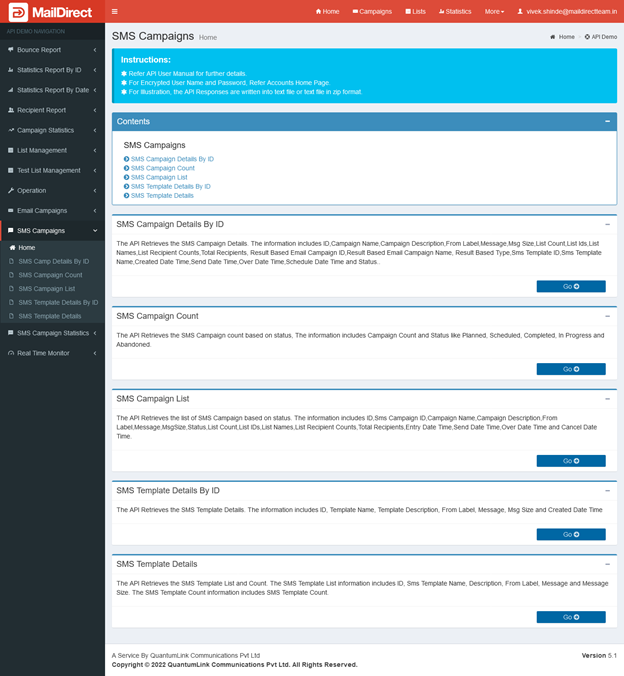 API DemoSMS Campaign Report SMS Campaign Home SMS Campaigns Report Home This page provides the details of the functionality of the API's in SMS Campaigns Report Section. Clicking on redirects to Demo section of the corresponding API. Figure : SMS Campaign - Home page