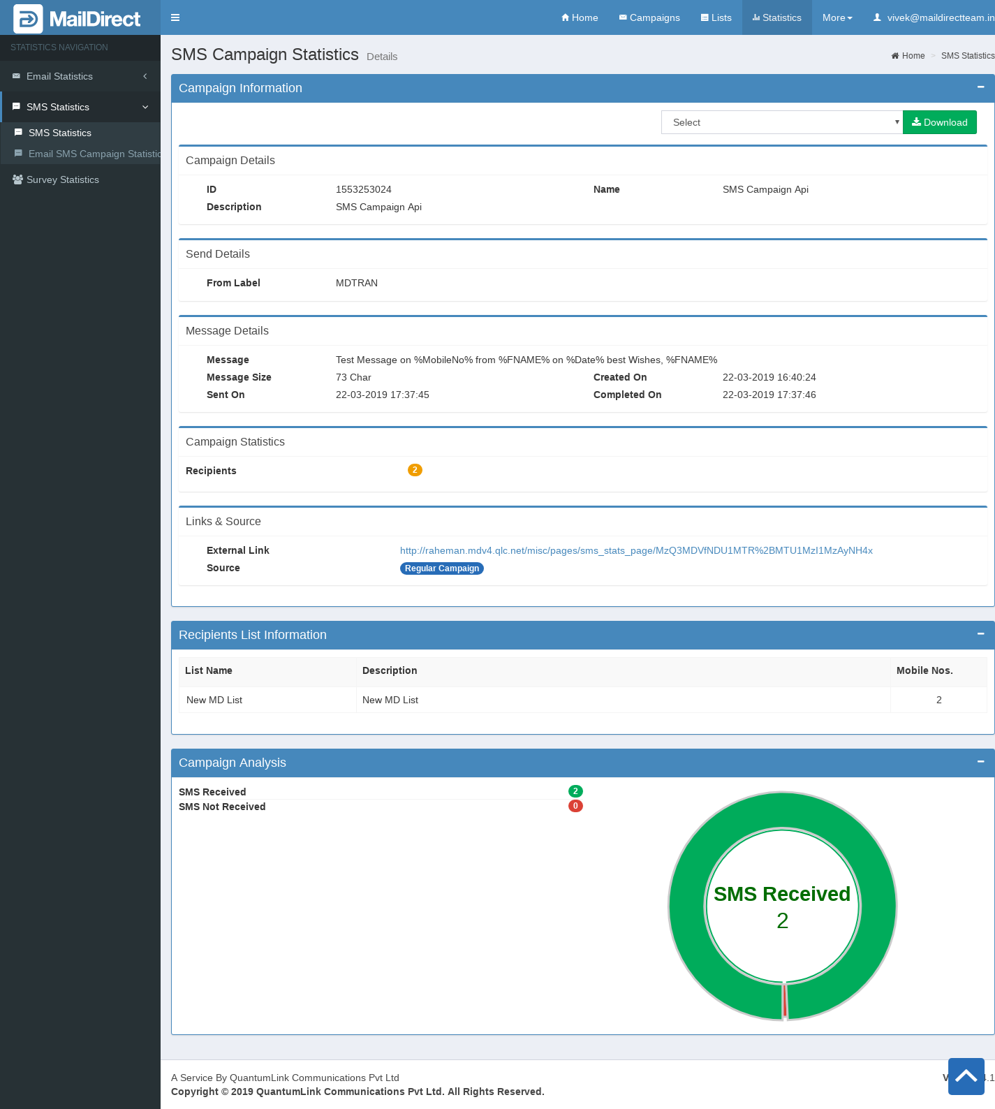 Figure : Statistics > SMS Campaign Details