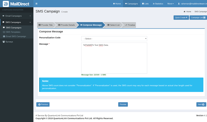 - Mail Direct displays the SMS Campaign Wizard Preview screen.