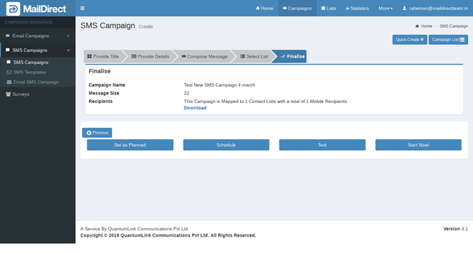 The section provides the details of Campaign Name, Message Size and No of Recipients and Lists Mapped along with option to download Recipients. It also contains the actions buttons for the necessary action.