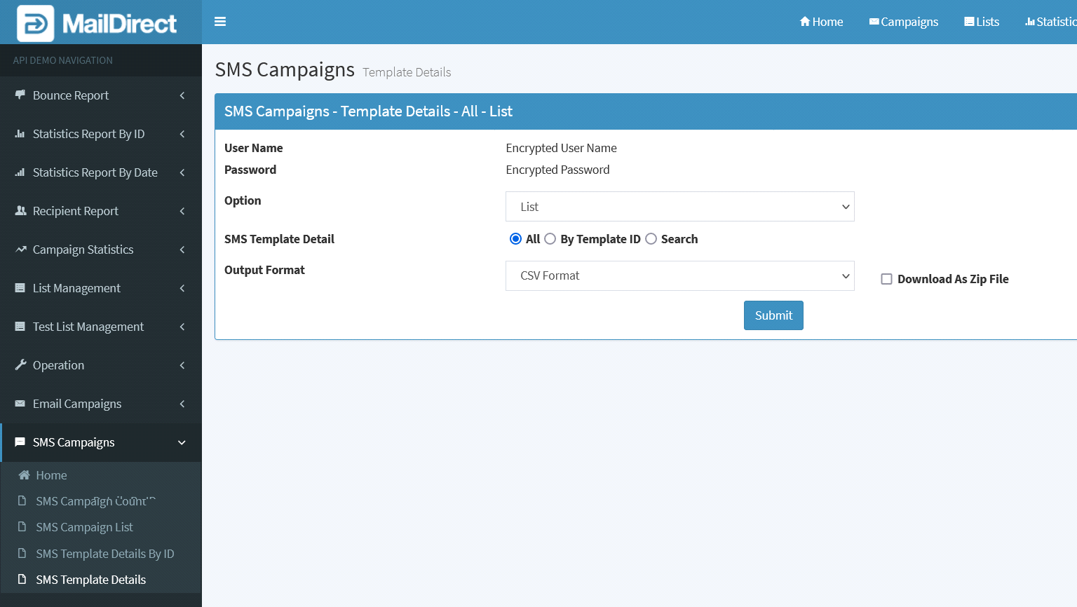 - The API is used to display SMS template details and SMS template count based on SMS Template ID, Search and All.