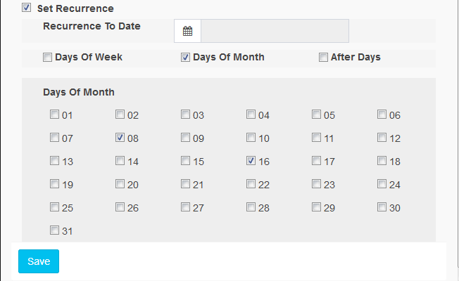 If Day of month option is selected then Days from 01 to 31 is visible. Single or multiple days can be selected. The Schedule campaign will be created based on days of month selected.