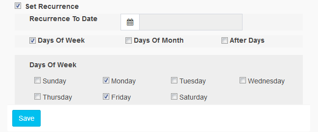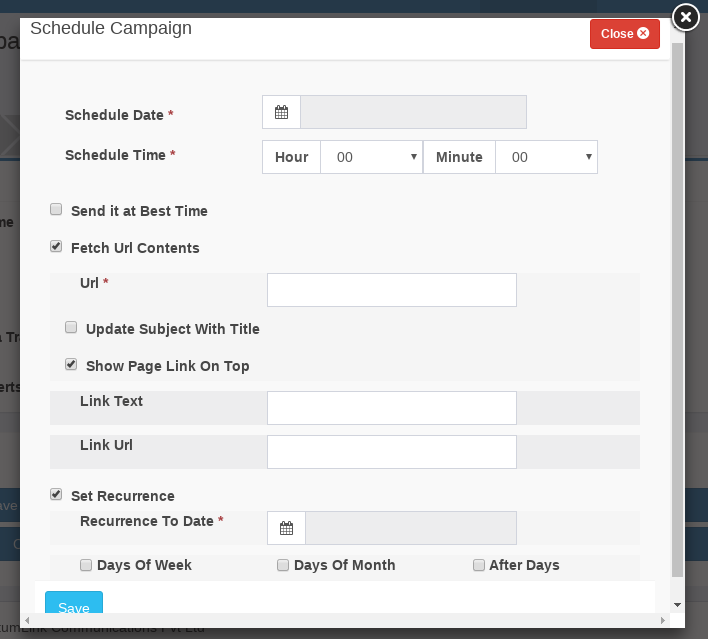 If selected then it shows Recurrence To Date, Day Wise and Days fields. It is a mechanism to copy and schedule campaigns for the particular date and time. |