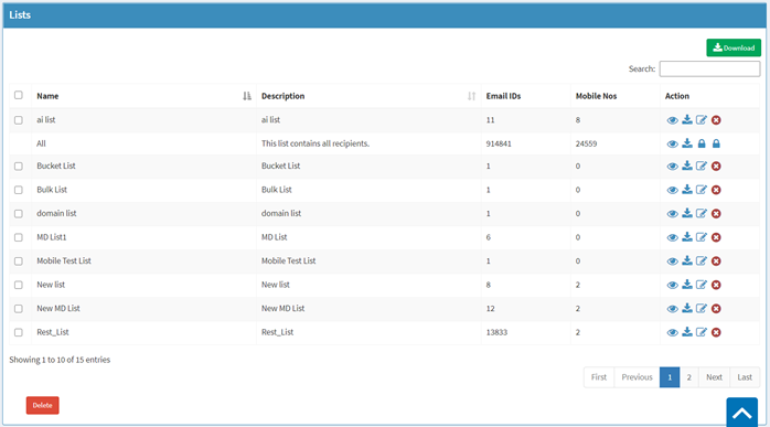 The list section provides the details of Contact List, with individual row which displays List Name, List Description Email IDs mapped to the List, Mobile Numbers mapped to the list and Action. The Actions include