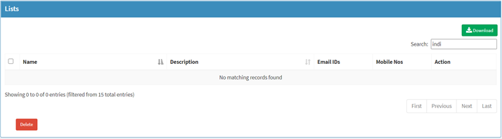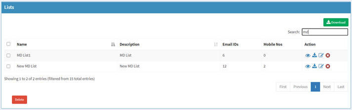 Delete List. Search option is provided to Search the Lists.