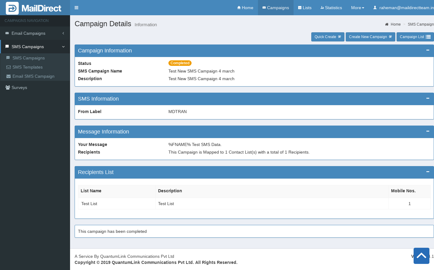 - Mail Direct displays the SMS Campaign Details screen.
