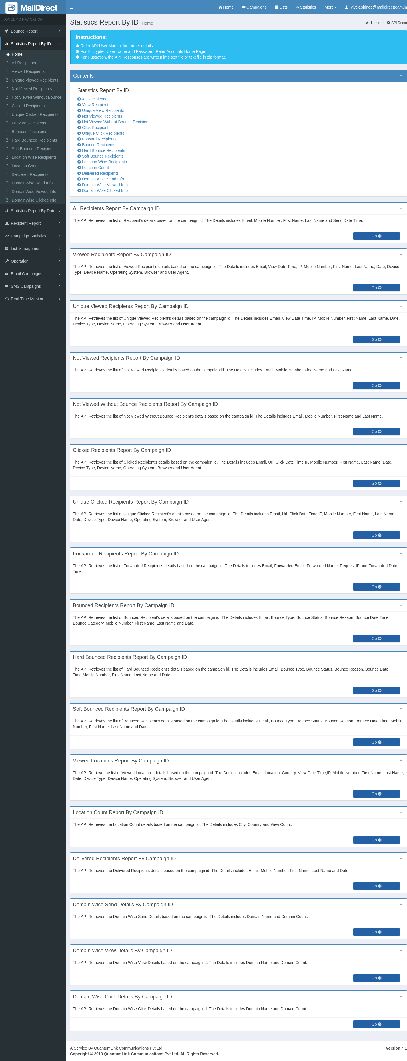 This page provides the details of the functionality of the API's in Statistics Report By Campaign ID Section.