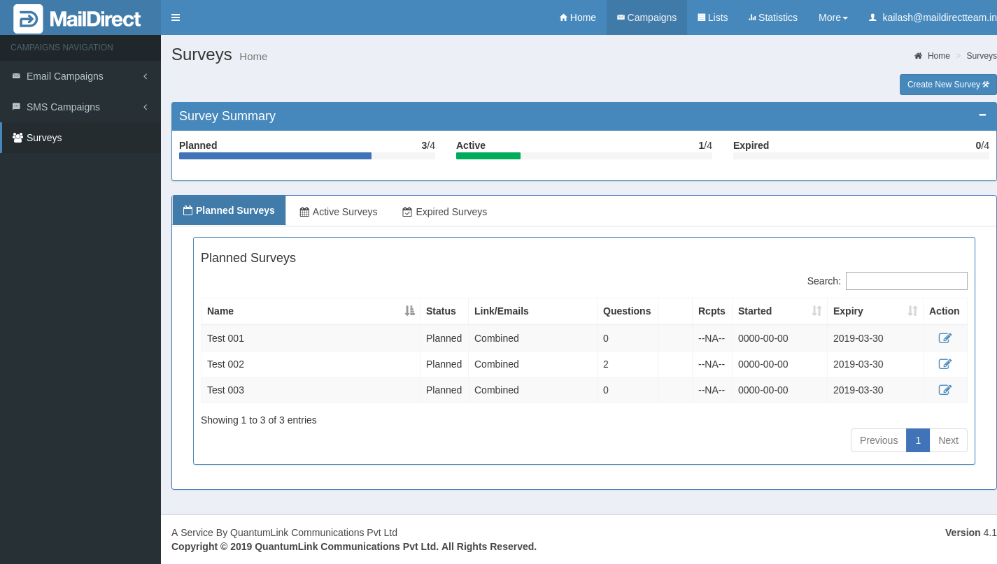 The list of Planned, Active and Expired Surveys are provided in Tabs, with individual row which displays Survey Name, Status, Link/Emails, Number of Questions, Number of Responses (For Active and Expired Surveys), Recipients, Started Date, Expiry Date and Action. The Actions include