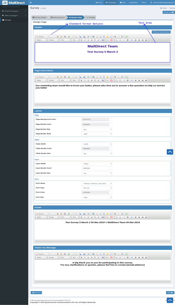 Working with Campaign ManagerManage SurveyCreating Survey Survey Wizard – Design Page Survey Wizard – Design Page Figure : Create Surveys - Design Page