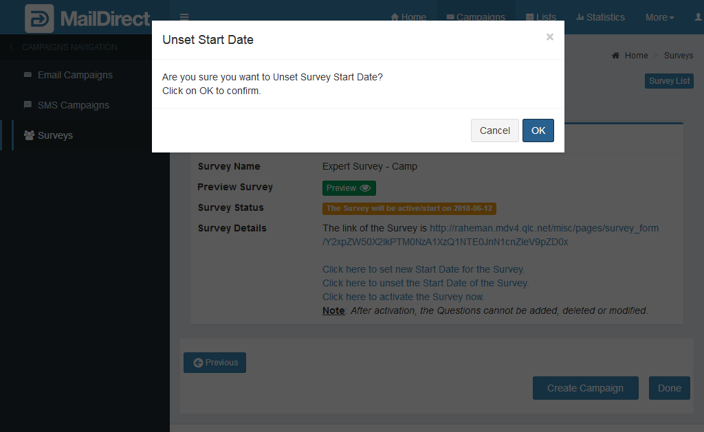 - Click the link “Click here to unset the Start Date of the Survey” to unset Start Day