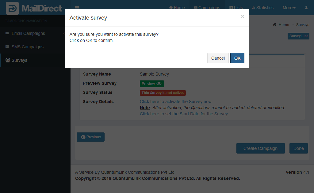 To Activate the Survey instantly click the link - Click here to activate the Survey now. An Alert is generated to confirm the Activation.