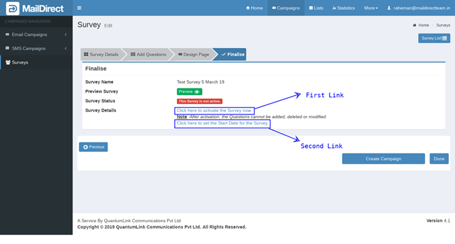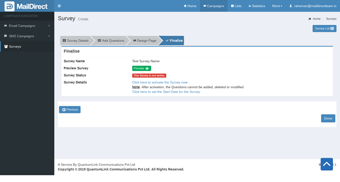 On Confirmation the Survey is activated and the Finalize Section will display as: