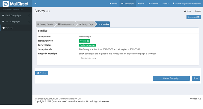 Figure : Create New Survey-Finalize Page - Survey with option – Invite via Email