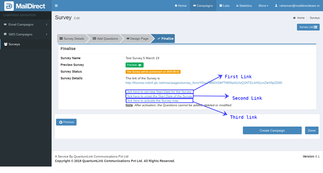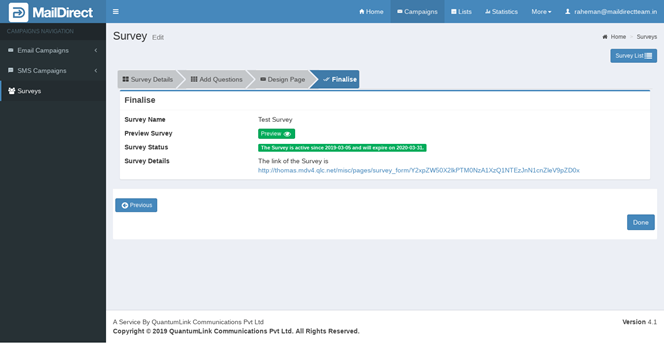 The link of the Survey is displayed, which can be used to respond to Survey.