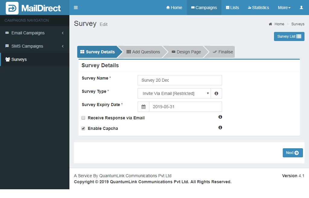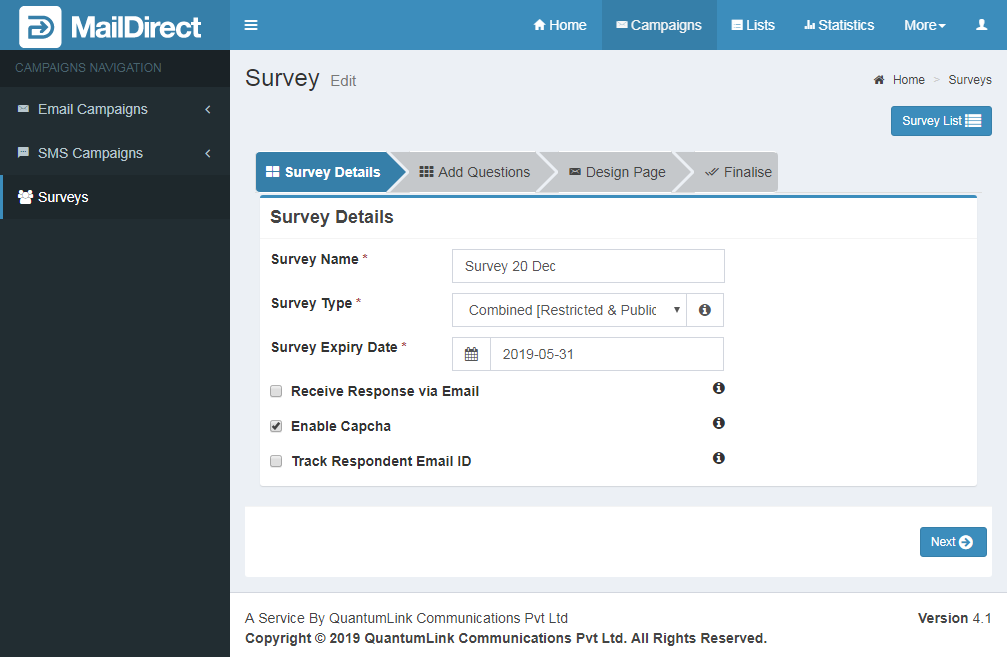 Figure : Create Surveys - Survey Details – Invite Via Email