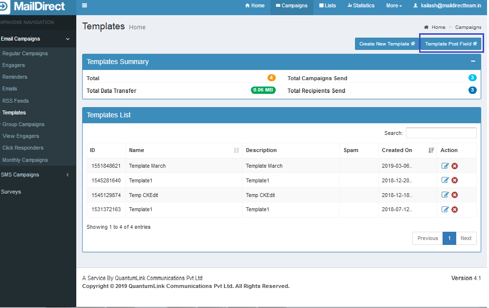 Working with Campaign ManagerManage Template Template Post Fields Template Post Fields In this section we learn how to do Template field post Click the Template Post Field link in Template Home to view Template Post Field Home page. Figure : Template – To Create Template Post field
