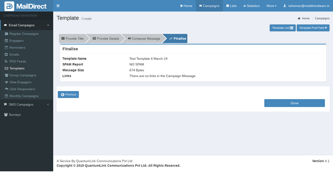 - Mail Direct displays the Template Campaign details in the Finalize Section