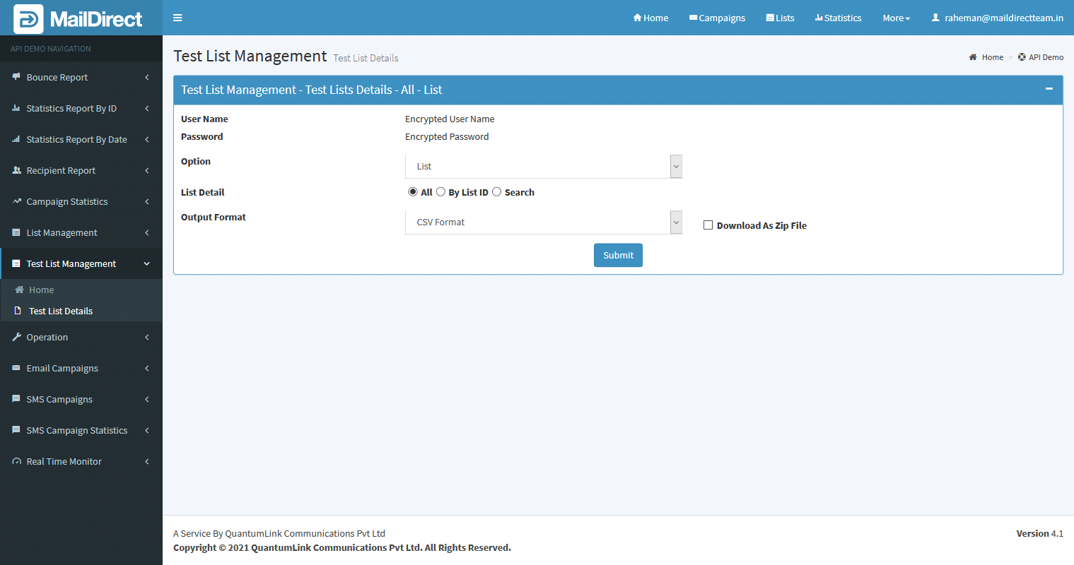 - The Details File downloaded in the form of zip if Download As Zip File is checked or download simple text file.