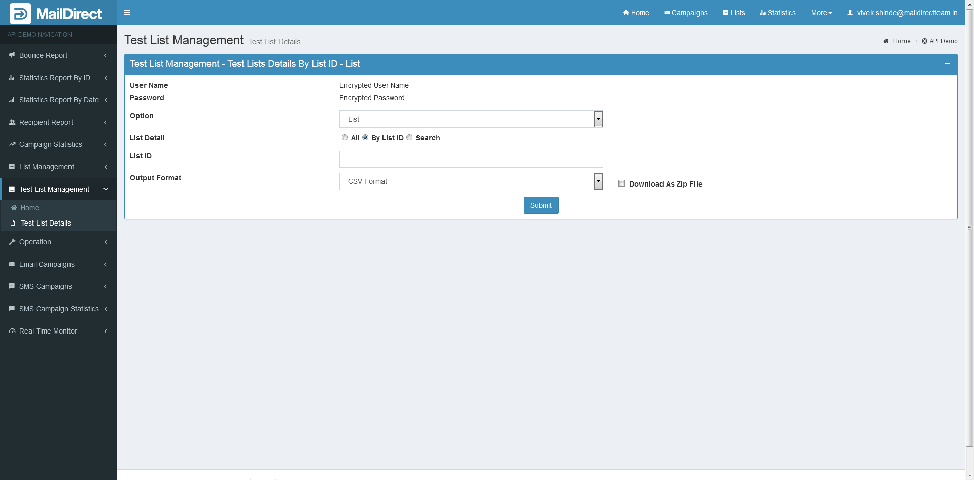 - The Details includes ID, ListName, Description, TotalEmails and TotalMobileNo.