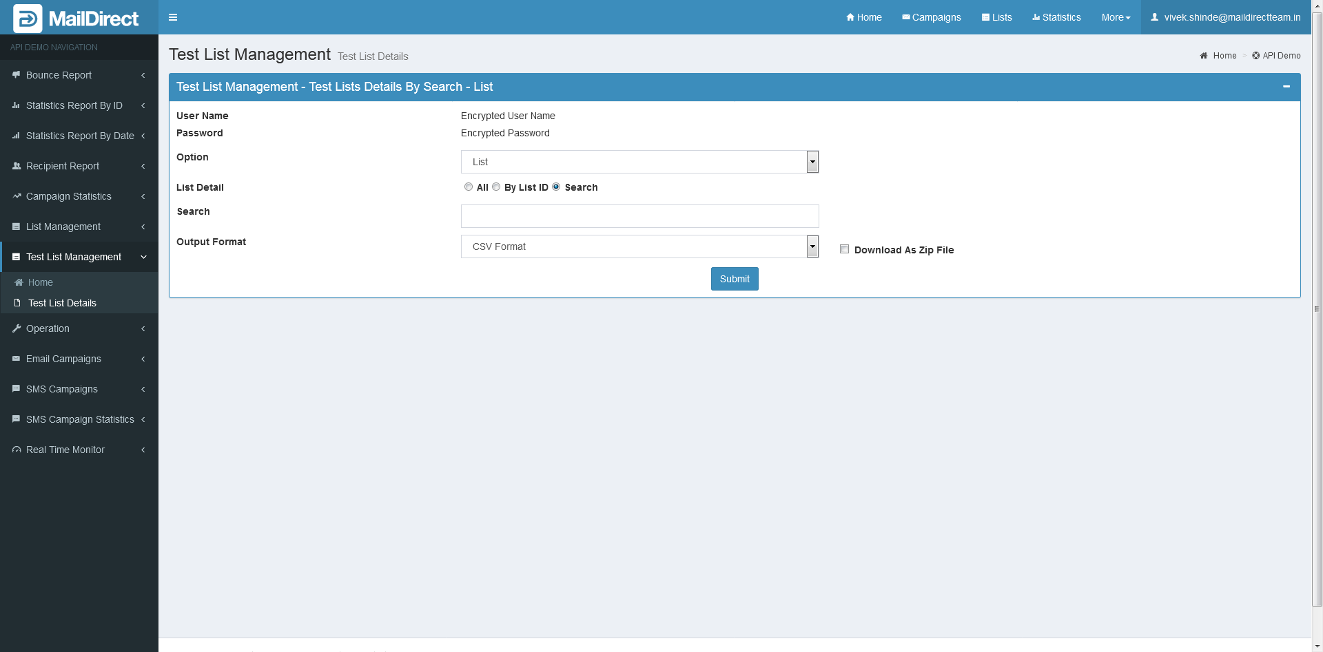- The Details includes ID, ListName, Description, TotalEmails and TotalMobileNo