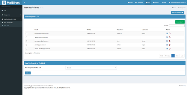 The list of Test Recipient is displayed in Test Recipient Lists Section with individual row having details of Email, Mobile, First Name, Last Name and Action. The Actions include