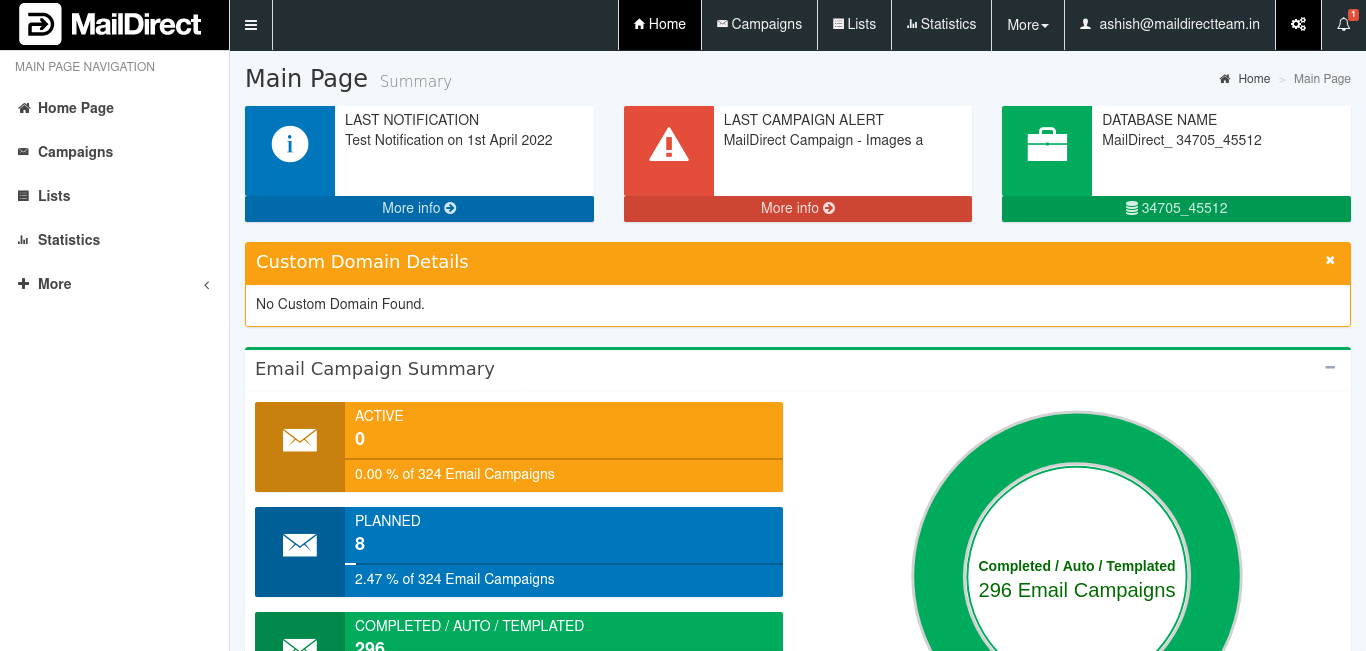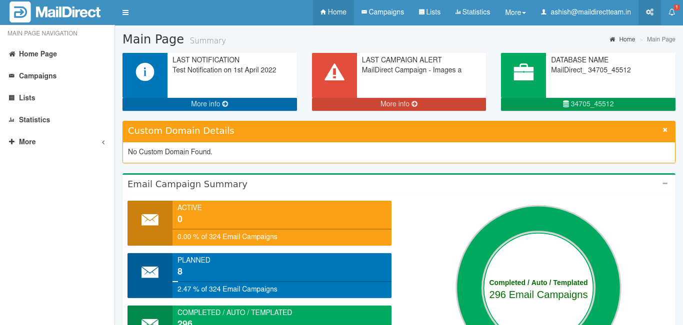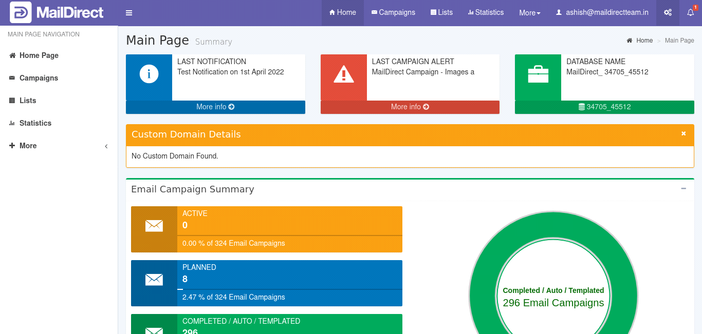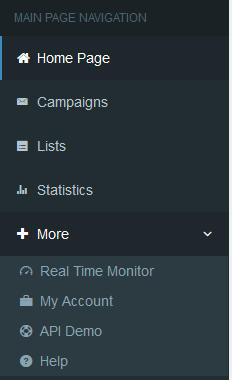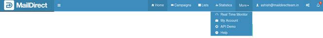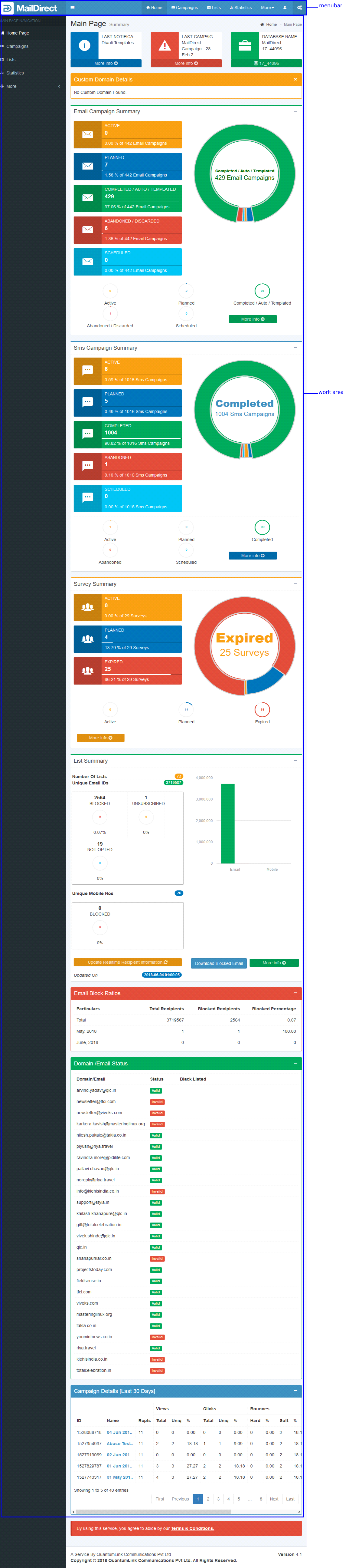 MailDirect is a browser independent service. The user interface consists of a menu and the area below the menu, organized according to the options selected from the menu.