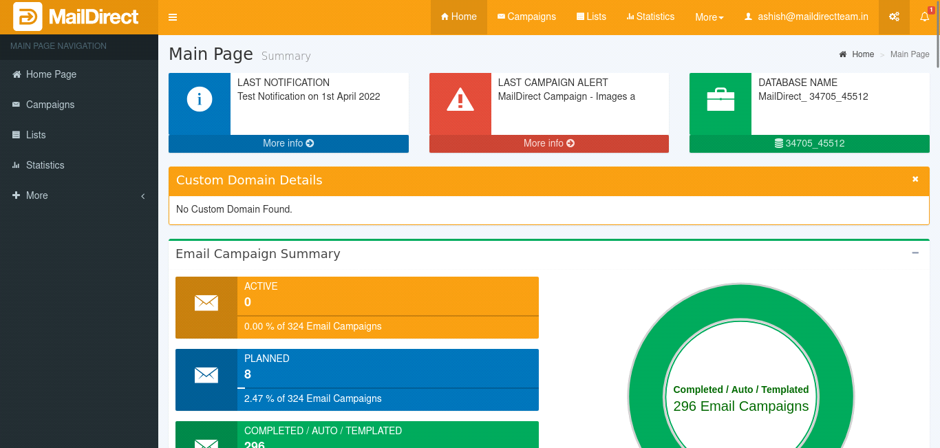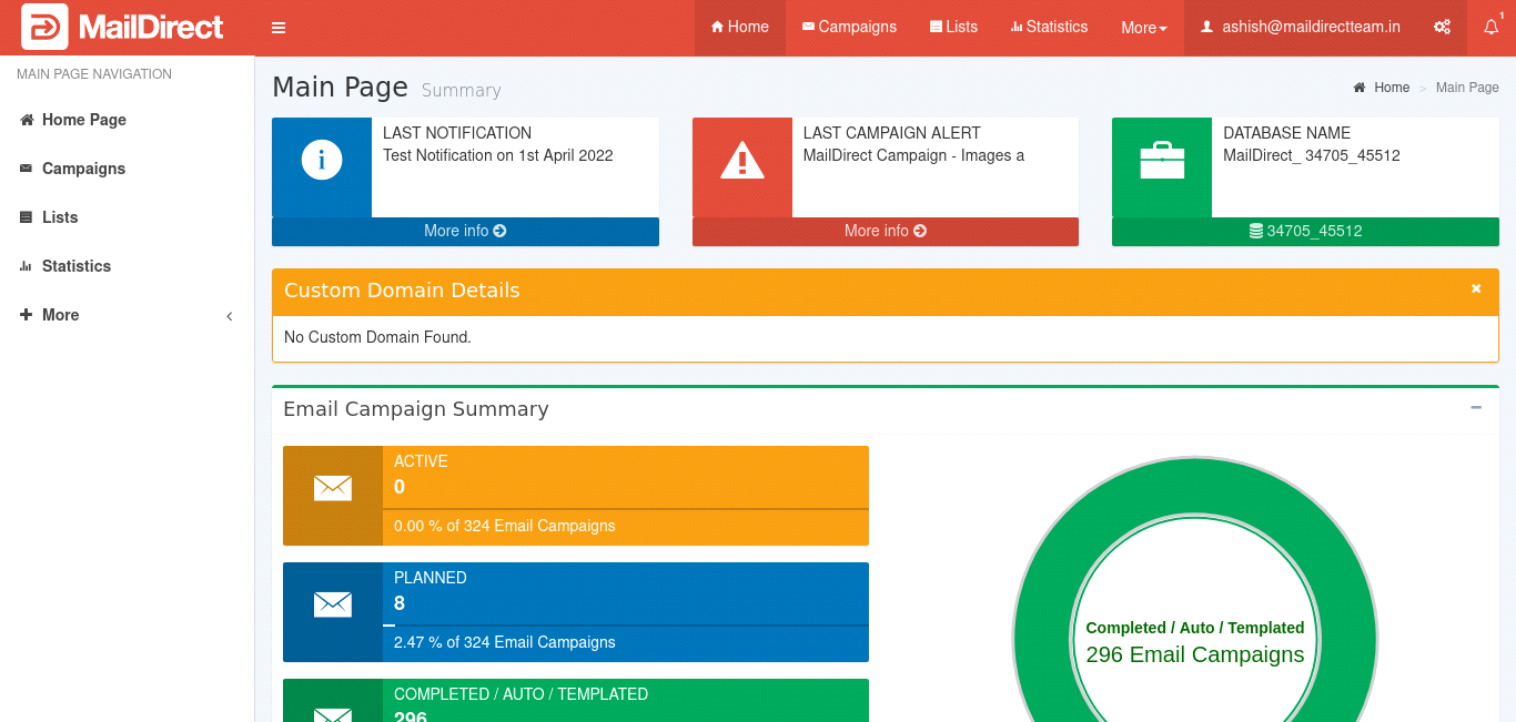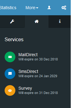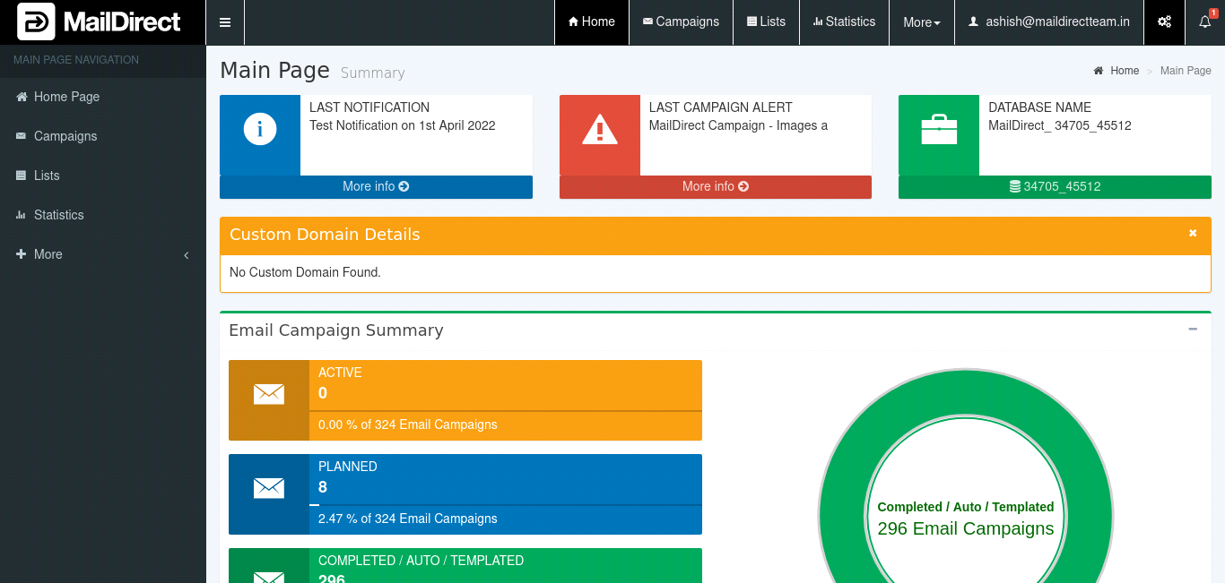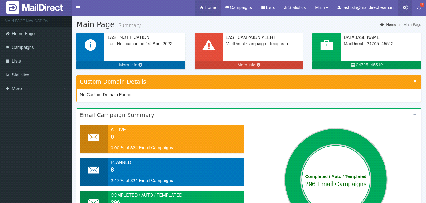 MailDirect is a browser independent service. The user interface consists of a menu and the area below the menu, organized according to the options selected from the menu.