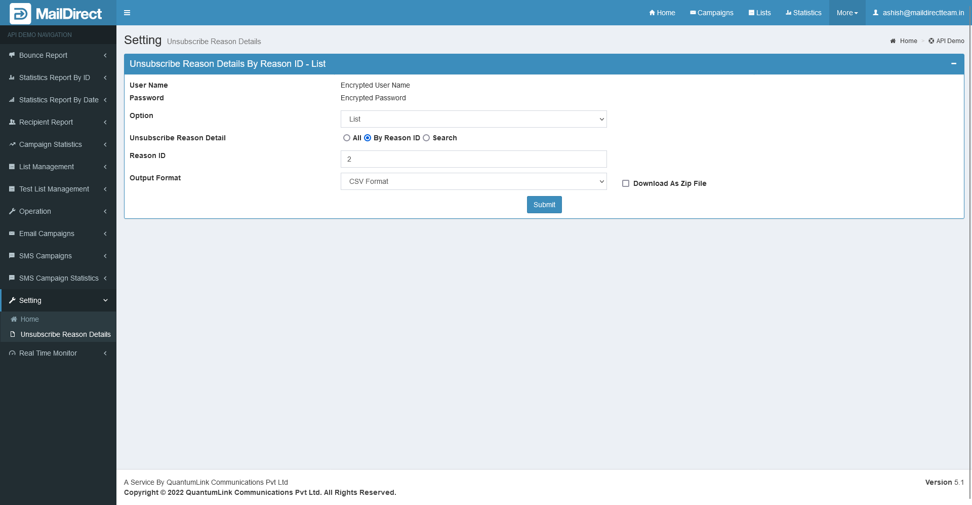- The API retrieves the list of Unsubscribe Reason details By Reason ID. The Details includes ID, Reason Name and Description.