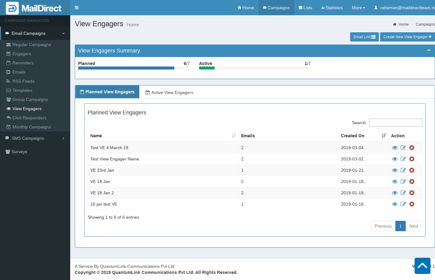 The list of Planned and Active View Engager are provided in Tabs, with individual row which displays View Engager Name, Number of Emails Mapped, Created On Date and Action. The Actions include