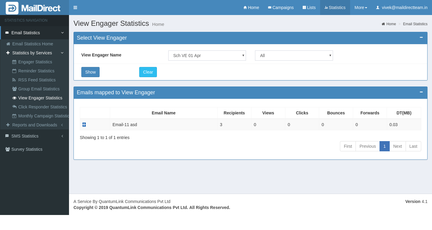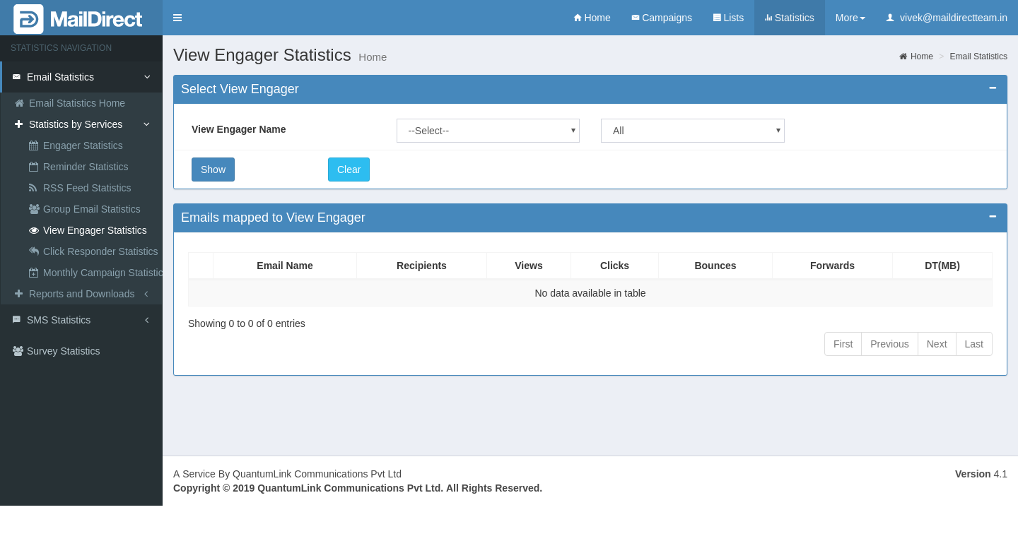 This section displays the two drop-downs 1. View Engager List 2. All, Date wise (Engager) When users selects any view engager from view engager list drop-down, and select all option from other drop-down and click on Show button, MailDirect displays Email Details which is mapped to the view engager screen.