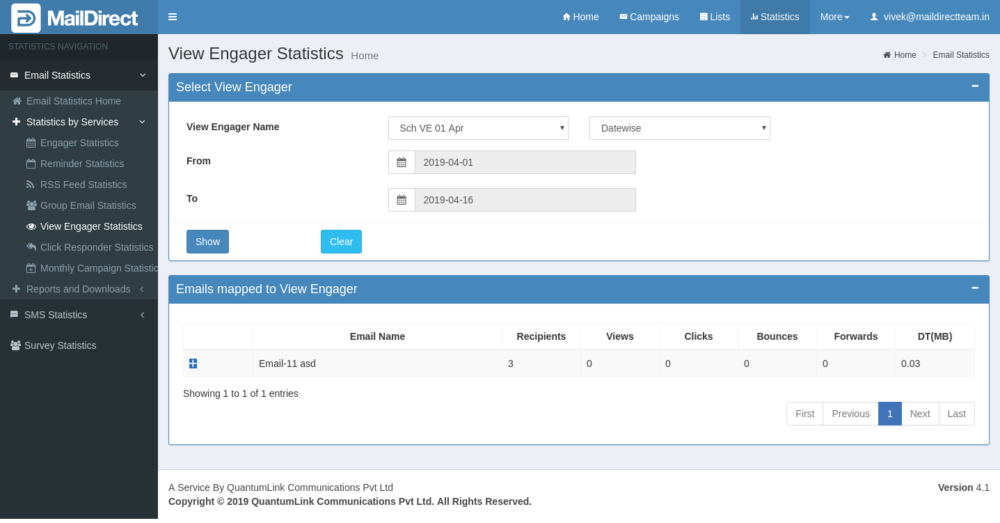 The View Engager Statistics displays the list of Email Campaigns Send, whenever the View Engager is triggered based on View Engager Selected. User can select All Campaign Send or based on the Date Range Selected. The Campaigns are grouped based on the Email mapped to the View Engager.