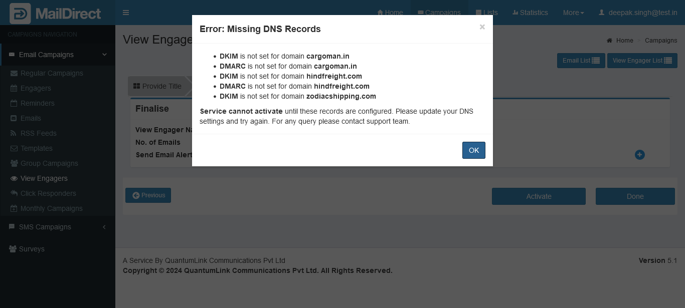 Note: Users who fail to configure DNS records, such as DMARC, SPF, and DKIM, will have an error message popup and won't be able to continue until DNS records are configured. At this stage the user is not allow to activate View Engager when map emails with domains that do not have DNS records configured.