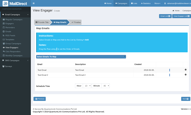next button - Mail Direct displays the View Engager Campaign Finalize Page