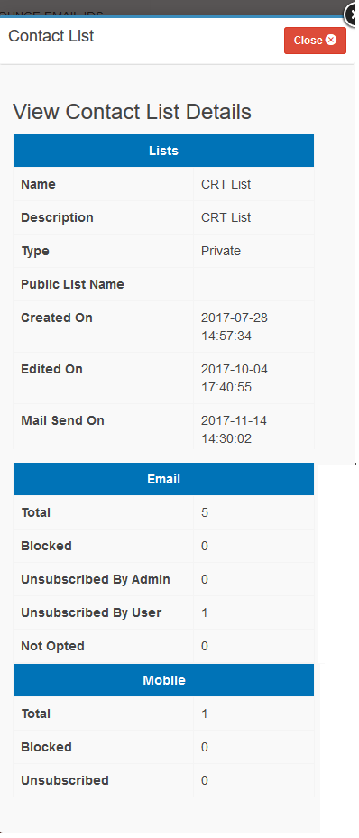 Working with List ManagerList HomeTo Manage List View Lists View Lists To View a List. Click the View option corresponding to the list to be viewed. MailDirect displays the POPUP, View Contact List Details screen. Where user can see all details of the contact list. Figure : Contact List View