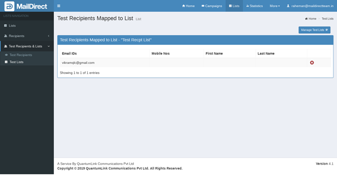Button from action column. - MailDirect will displays Test Recipients Mapped to List screen, here displays list of recipients mapped to this test list.